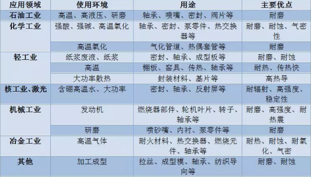 碳化硅以共價鍵為主,共價鍵約占88%。晶格的基本結構是互相穿插的SiC4和CSi4四面體。SiC具有α和β2種晶型,當溫度低于1600℃時,SiC以β-SiC形式存在,當高于1600℃時,β-SiC轉變?yōu)?amp;alpha;-SiC形式。碳化硅陶瓷在現代的工業(yè)中碳化硅起著不可或缺的作用。表1詳細地列出了其用途。